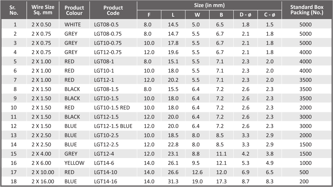 The 'elmex' Insulated Twin Lug is ideally suitable to accommodate two wires of identical size ranging 0.5 to 16 sq mm. Twin End Lug finds Its applications in Energy Distribution Boards, Machines, Panels, Switch Boards etc.