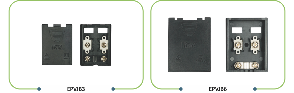 elmex PV Solar 2 - Rail Junction Boxes EPVJB3 and EPVJB6 are suitable for Solar Street Light Low Wattage (less than 50W) Panels. They are designed with sliding snap fit locking arrangement, available with 2 - in and 1 - out cable connections.