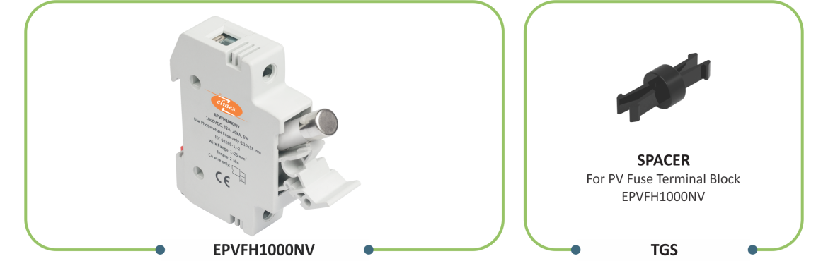 elmex PV Solar Fuse Terminal Block EPVFH1000NV is suitable for photovoltaic application and applicable for string protection. It is designed for use in connection for photovoltaic devices like DC and AC Distribution Box , Inverters, String Combiner boxes, etc. which is used for rooftop or ground mounted projects. The fuse terminal block is constructed as per standard IEC 60269-1 and are suitable for cylindrical gPV fuse size ø 10 X 38 mm. Fuse Terminal blocks can be mounted along with spacer. The Spacer creates gap between adjacent fuse holders and this gap allows circulation thereby reducing operating temperature.