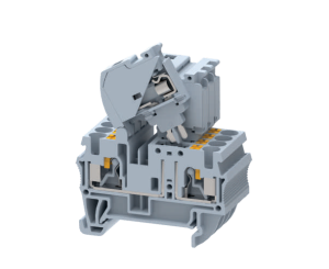 elmex three level terminal blocks can be used for high-density wiring and for wiring special equipment such as proximity sensors. DUSD4 has a special link attached to the middle and lower level to facilitate the interconnection between adjacent terminal blocks, DU3D4 and DUSD4. The negative and positive circuits can be easily bridged together and then connected to a power source with DU3D4 terminal.